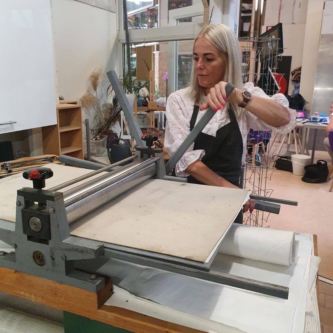 Je tekent eerst je ontwerp op papier, legt daar je acrylplaatje (A5-formaat) op en krast met een scherp pennetje de afbeelding in de plaat. Die smeer je helemaal in met speciale, milieuvriendelijke inkt om het daarna voorzichtig weg te wrijven of gedeeltelijk te laten zitten. Vervolgens leg je de plaat op de grote drukpers, waarna je ontwerp wordt afgedrukt op katoenen papier. Aan het einde van de workshop ga je naar huis met vier eigen prints, elk uniek en met de hand gemaakt!